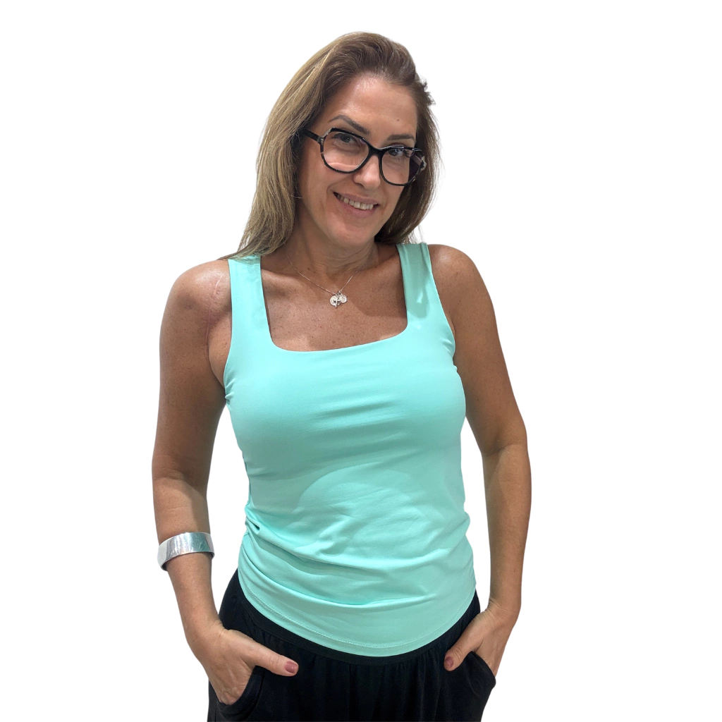 Com um decote elegante e quadrado , a modelagem desta regata foi pensada para valorizar o colo e proporcionar um ajuste perfeito ao corpo . A parte frontal é dupla até a metade, enquanto a parte de baixo é mais ampla, garantindo conforto e disfarçando pequenas imperfeições. Essa combinação realça a silhueta de forma harmônica e sofisticada.